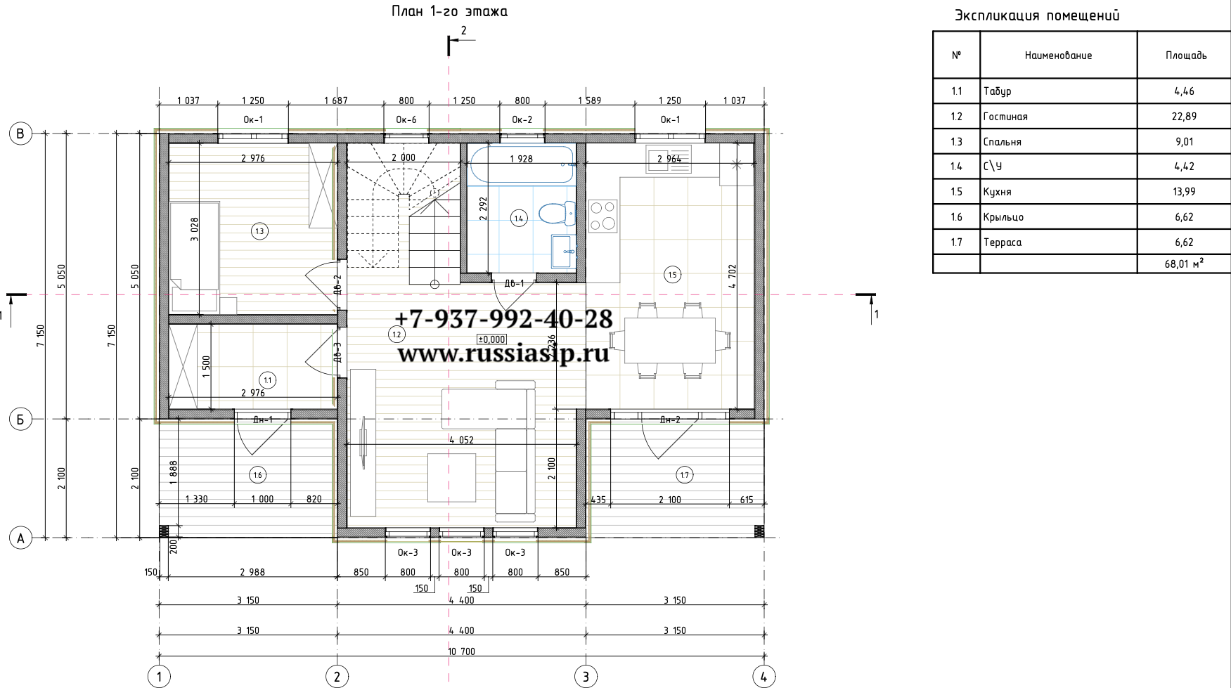 1 ЭТАЖ: тамбур 4,46м2, гостиная 22,89м2, спальня1 9,01м2, с/у1 4,42м2, кухня 13,99м2, крыльцо 6,2м2, терраса 6,62м2