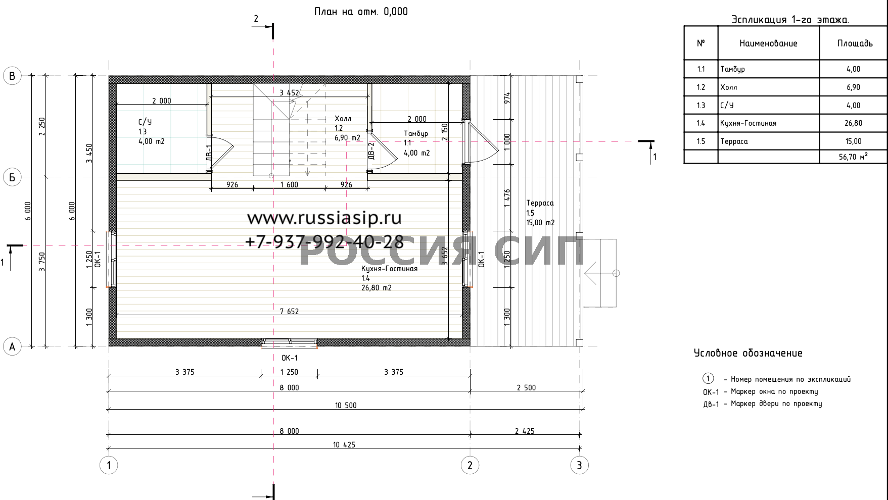 1 ЭТАЖ: тамбур 4м2, холл 6.9м2, с/у 4м2, кухня-гостиная 26.8м2, терраса 15м2 (опционно).