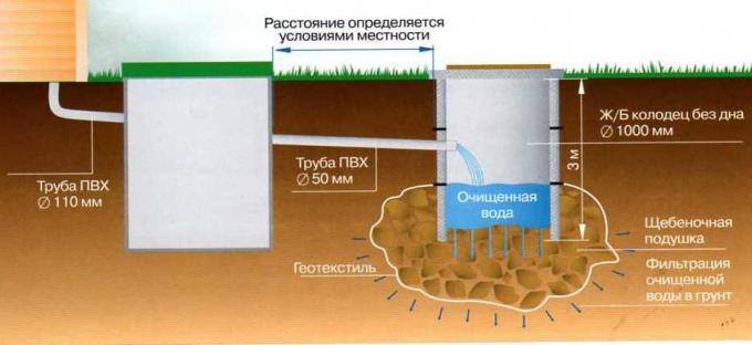 Данная канализационная система состоит из двух колодцев: первый колодец имеет герметичное дно, а второй — не имеет дна, но присыпан щебнем и песком.