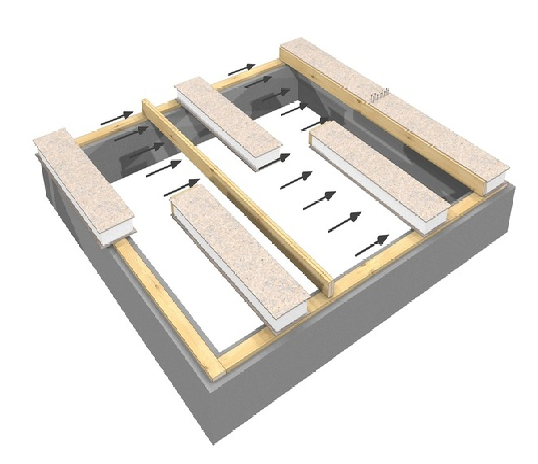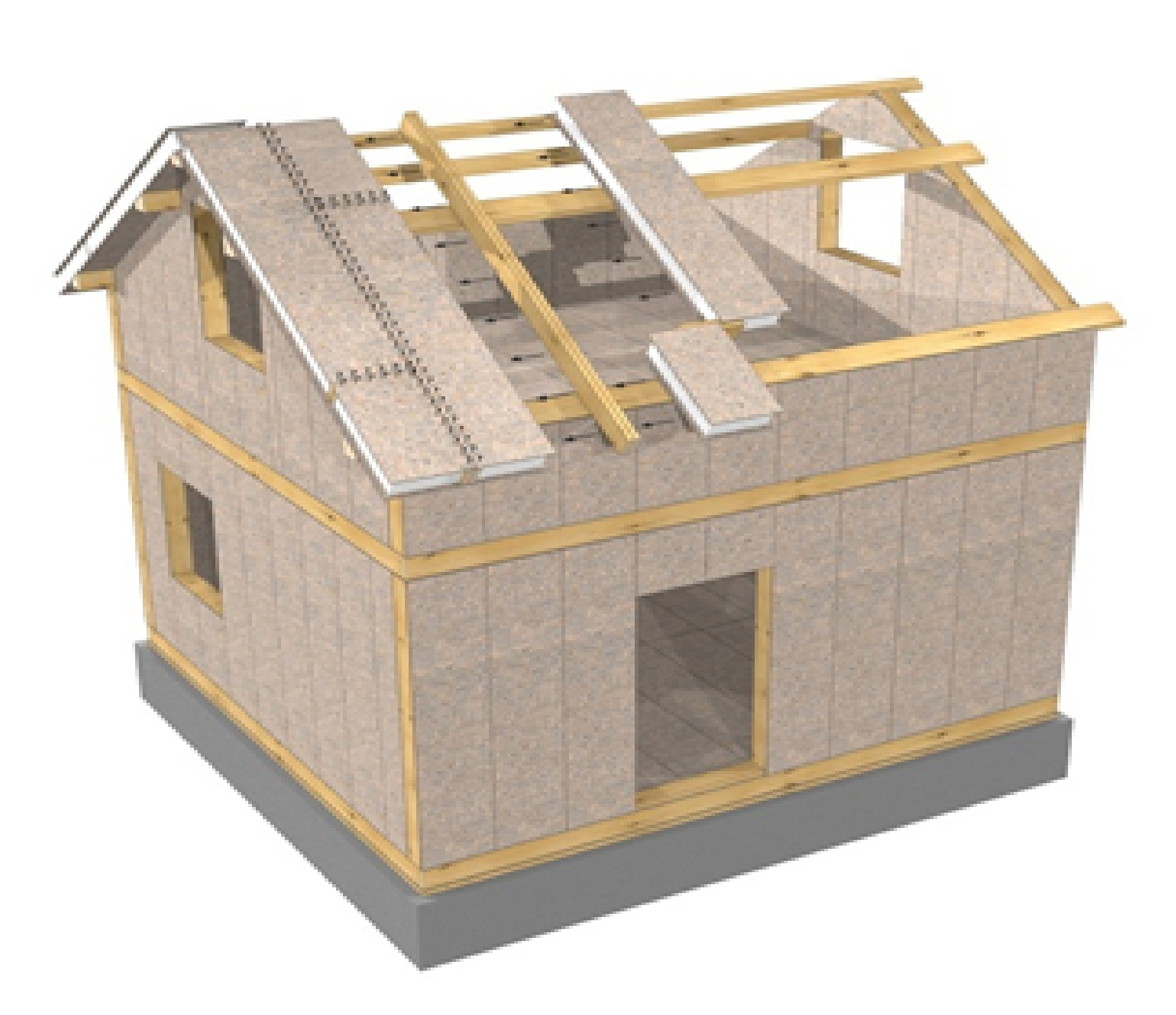 Процесс сборки дома из SIP-панелей довольно чистый, он наносит минимум вреда ландшафту и экологии. Практически все отходы утилизируются на месте. Стоящие рядом деревья можно сохранить, поскольку они не создают никаких помех сборке дома. Строить по SIP-технологии можно в любое время года. Монтаж дома начинается с крепления на готовый фундамент бруса, обработанного мастикой, являющегося обвязочным контуром для монтажа панелей. Плиты перекрытия укладываются на обвязочный брус, образуя ровный прочный щит. Несущим элементом нулевого перекрытия является деревянный брус, на который укладываются панели перекрытия.
