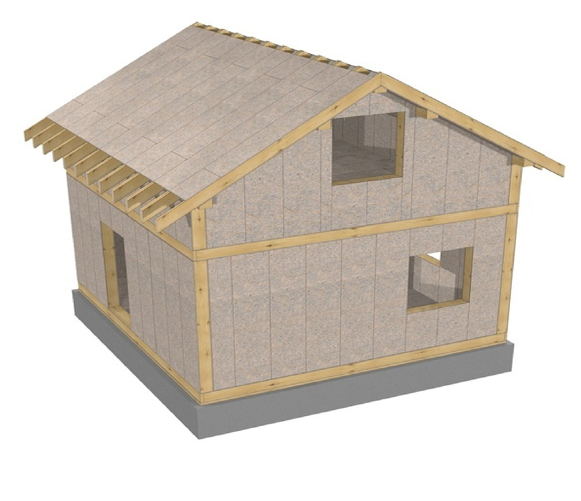 Межэтажные перекрытия выполняются из SIP-панелей (шаг между балками 625мм) (!), стандартной балочной конструкцией. После этого, согласно проекта, делается раскладка нижнего обвязочного бруса второго (или мансардного) этажа. Брус закрепляется длинными саморезами, сквозь панели перекрытия, к верхнему обвязочному брусу первого этажа. Монтаж стеновых панелей осуществляется также как на первом этаже. По завершению монтажа стен мансардного этажа устанавливаются мауэрлаты, прогоны и коньки. Сборка конструкции холодной кровли выполняется традиционными методами. Основными используемыми кровельными материалами являются мягкая черепица и металлочерепица.