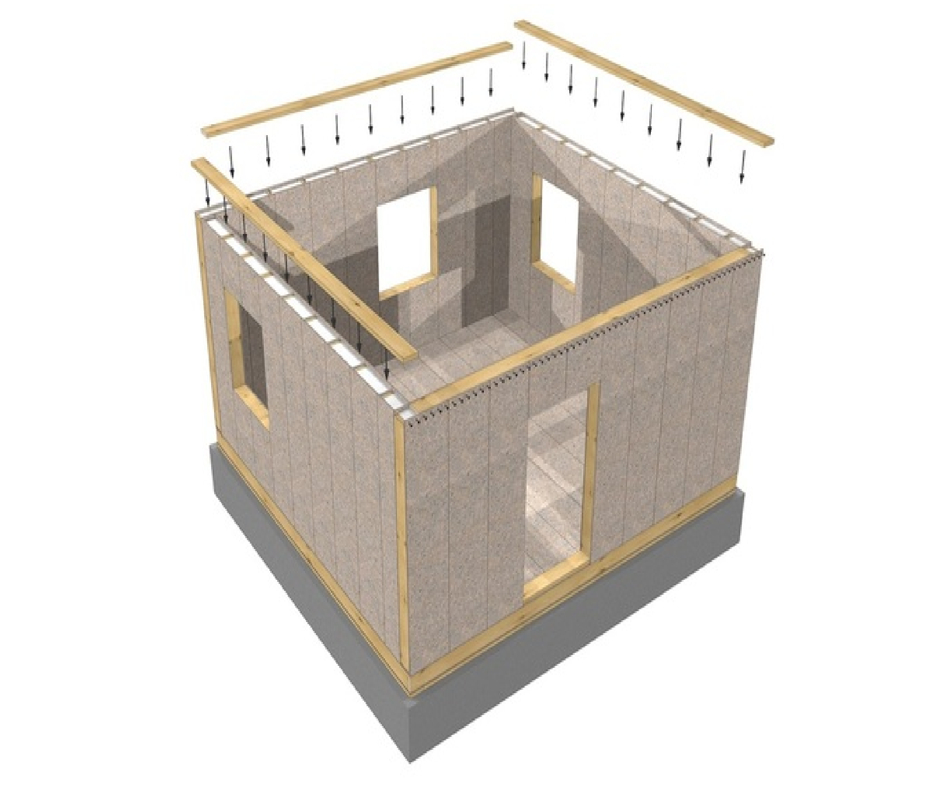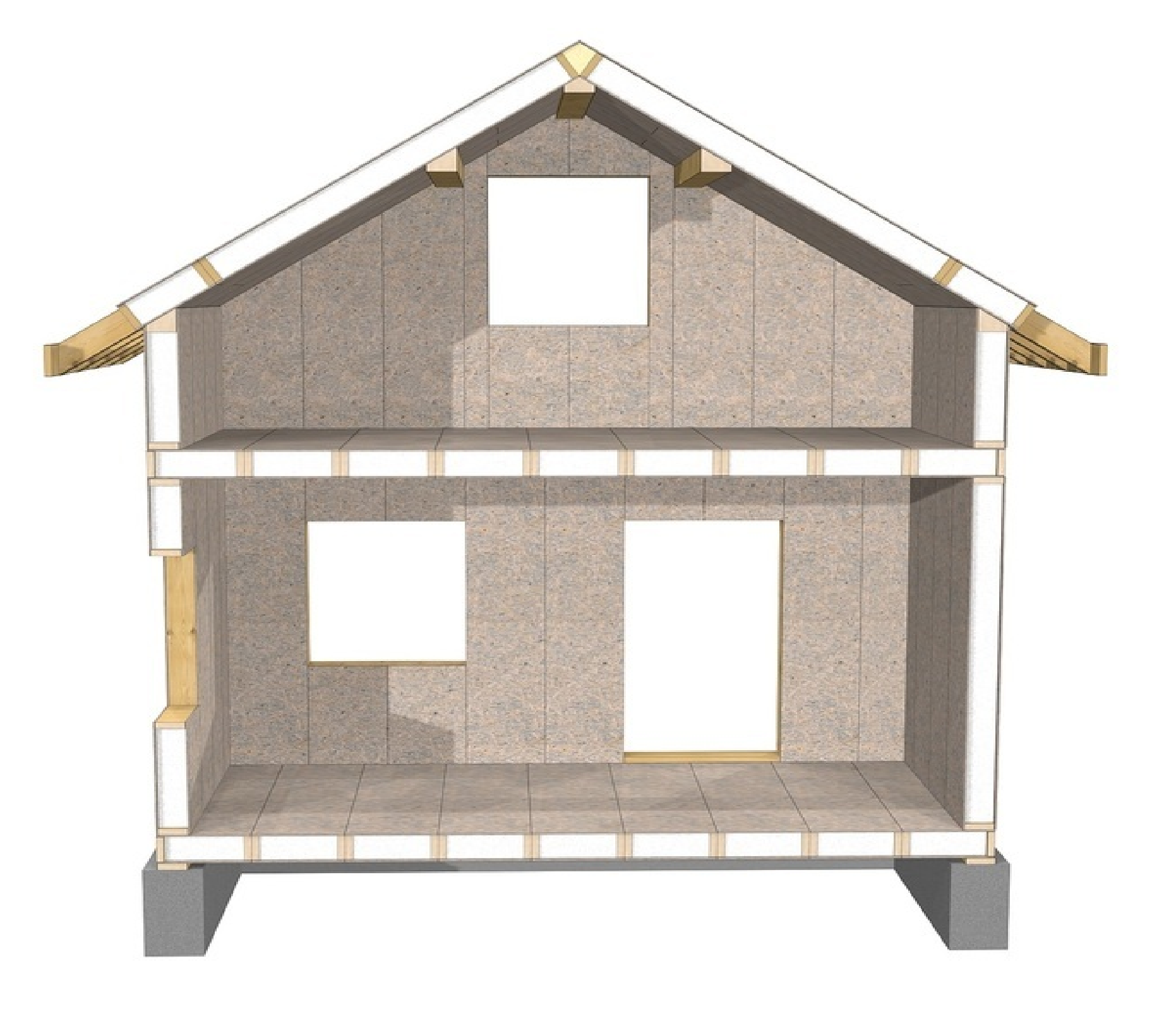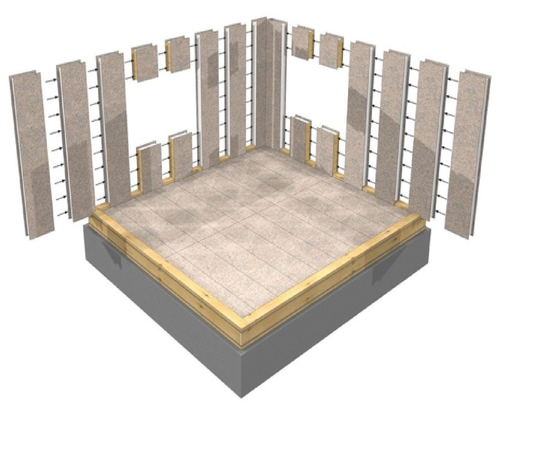 Все соединения выполняются с уплотнением монтажной пеной и собираются с помощью оцинкованных (!) саморезов. Монтаж стеновых панелей достигается с помощью замков типа "шип-паз". После установки стены первого этажа закрепляются верхним обвязочным брусом.